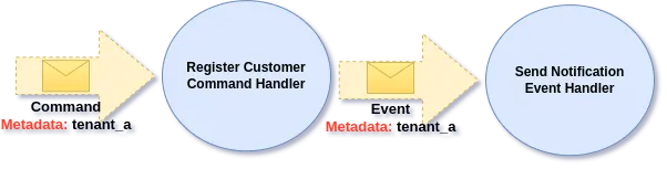 Whatever metadata we send at the beginning of the flow (e.g. Register Customer Command), we will be able to access in any **synchronous** or **asynchronous** sub-flows (e.g. Customer was Registered Event Handlers). This means we can easily pass things that are not directly related to Customer Registration Command and access them, in context which make sense. For example we could pass HTTP Domain, IP Address in Metadata, and access it in Event Handler that stores those for auditing.