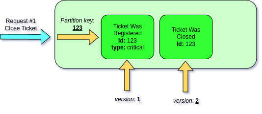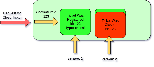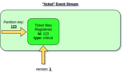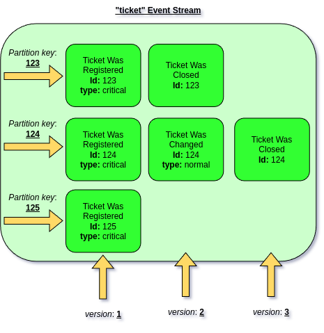 Therefore in order to partition the Stream, we need to know the partition key (in our case Ticket Id). By knowing the partition key and last version of given partition, we can apply an Event at the correct position.\