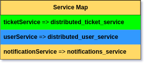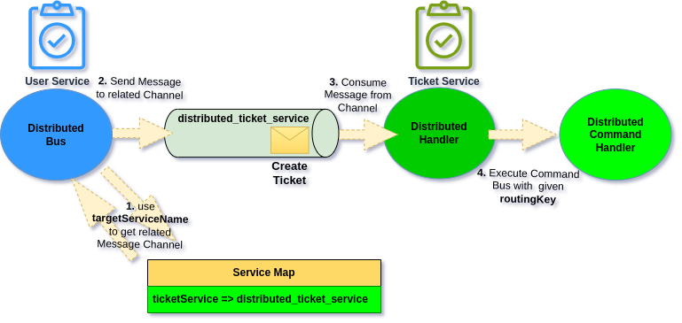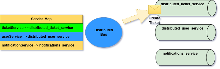 **Ticket Service** will be consuming incoming messages from "**distributed\_ticket\_service"** Messsage Channel. Therefore when we send Messages to ticketService we need to send it to that Message Channel, this will be done automatically by DistributedBus using Service Map.