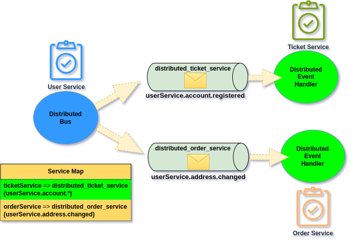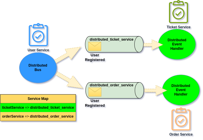Event distribution is a bit different from Command distribution. In case of Command we do have single Service that will receive the Message, in case of Events however there may be multiple of them.\